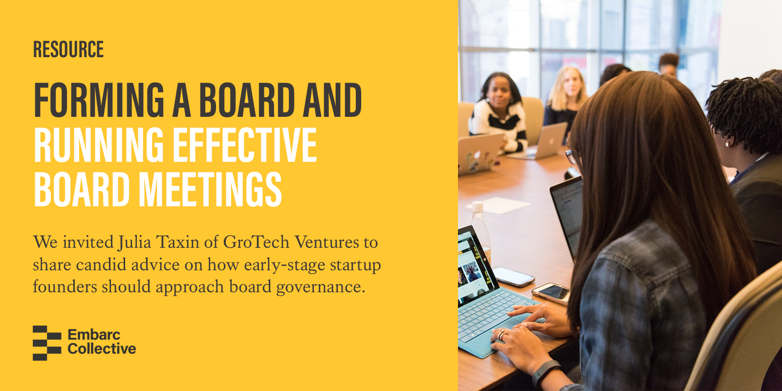 Recently, we invited Julia Taxin of Grotech Ventures to share tips with Embarc Collective members on how to run an effective board meeting. In this recap, we cover Julia’s top recommendations on how to form a board and how to run effective board meetings.